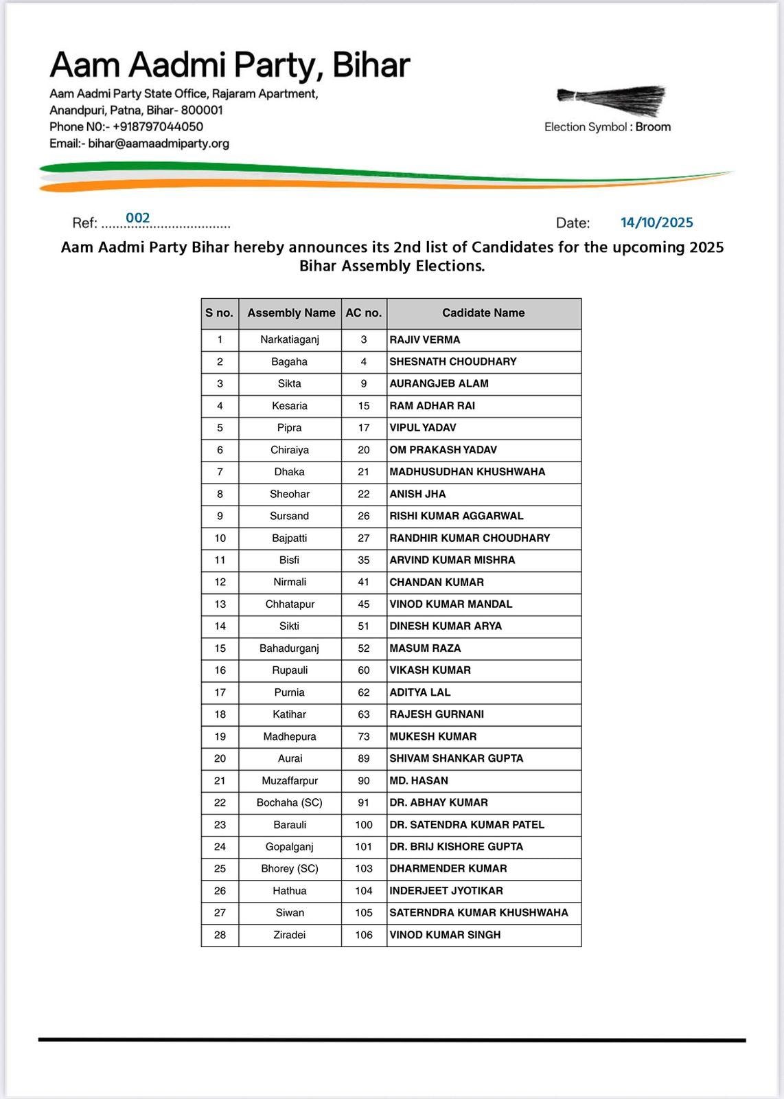 Bihar Election 2025: आम आदमी पार्टी ने दूसरी लिस्ट की जारी, 48 उम्मीदवारों के नाम, देखें पूरी लिस्ट