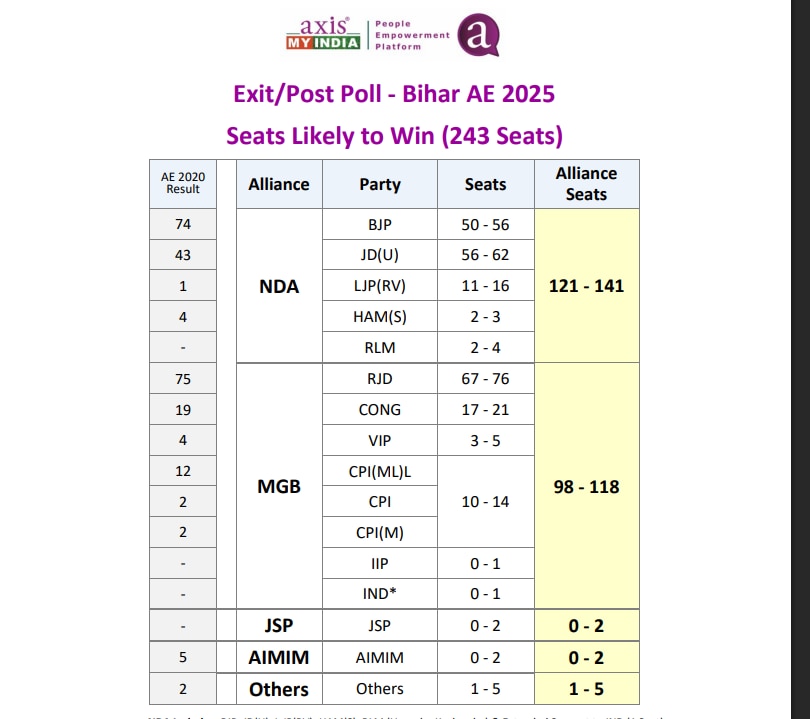 Axis My India के एग्जिट पोल के अनुसार, एनडीए को कुल 121 से 141 सीटों के बीच जीत मिल सकती है.
