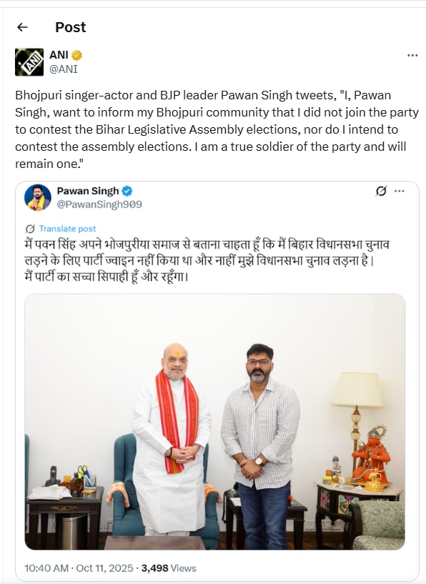 उन्होंने ये भी साफ किया कि उनका मकसद सिर्फ चुनाव लड़ना नहीं है, बल्कि पार्टी के लिए ईमानदारी से काम करना है. पवन सिंह ने यह दिखा दिया है कि वो केवल एक नेता नहीं, बल्कि एक जिम्मेदार पार्टी कार्यकर्ता भी हैं. अब ये साफ हो गया है कि पवन सिंह बीजेपी में रहकर संगठन के लिए काम करेंगे, लेकिन बिहार विधानसभा चुनाव में उम्मीदवार नहीं होंगे.