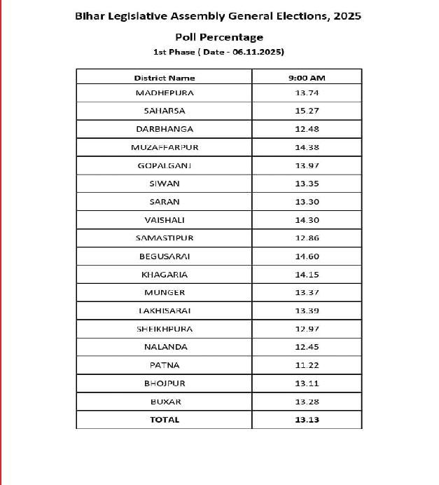Bihar Election 2025 Phase 1 Voting: बिहार में सुबह 9 बजे तक 13.13 फीसदी वोट पड़े हैं.