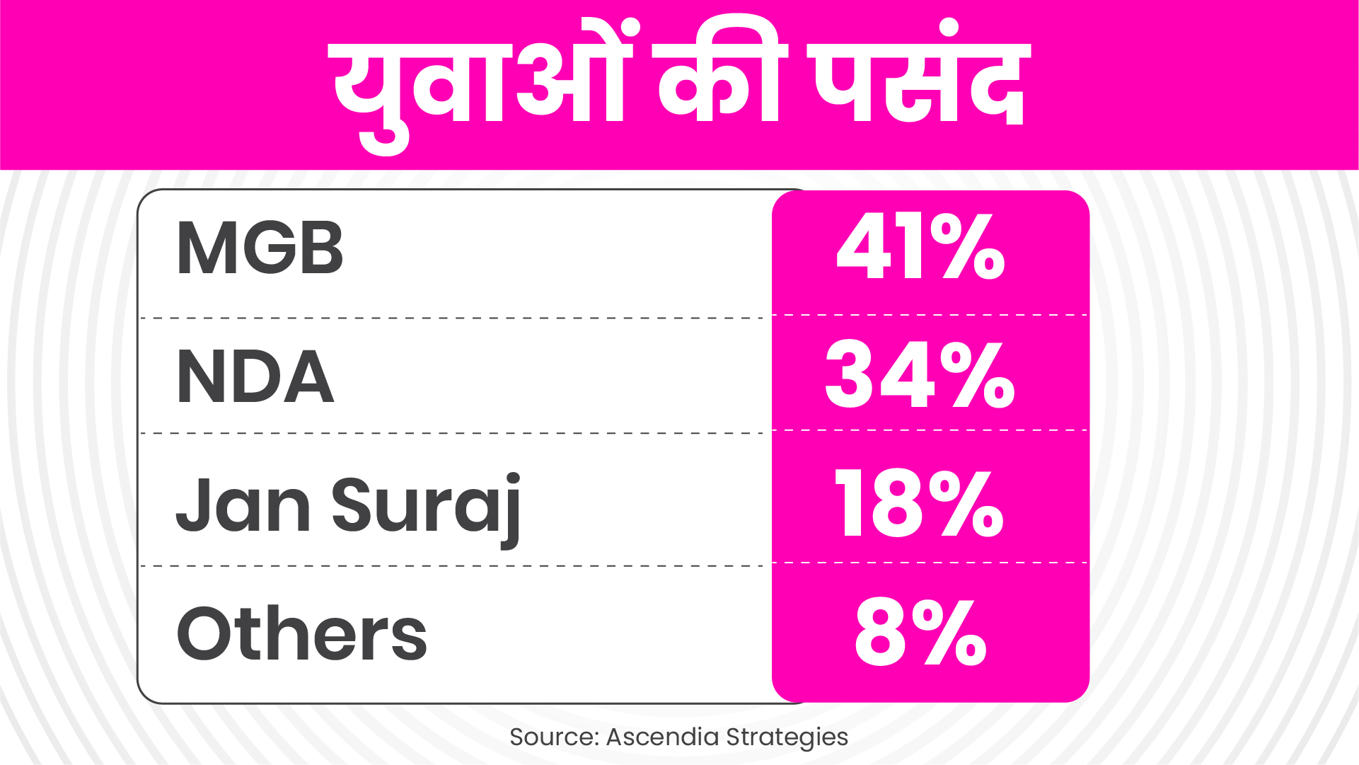 एक ओर महिलाएं जहां NDA के पक्ष में सबसे ज्यादा है, दूसरी ओर युवाओं का MGB(महागठबंधन) की ओर रुझान देखने को मिल रहा है. Ascendia सर्वे के मुताबिक 41 फीसदी युवा महागठबंधन को वोट देने की बात कह रहे है. यानी की युवा तेजस्वी यादव पर अपना भरोसा जता रहे हैं. जबकि 34 फीसदी युवा NDA के पक्ष में दिख रहे है.