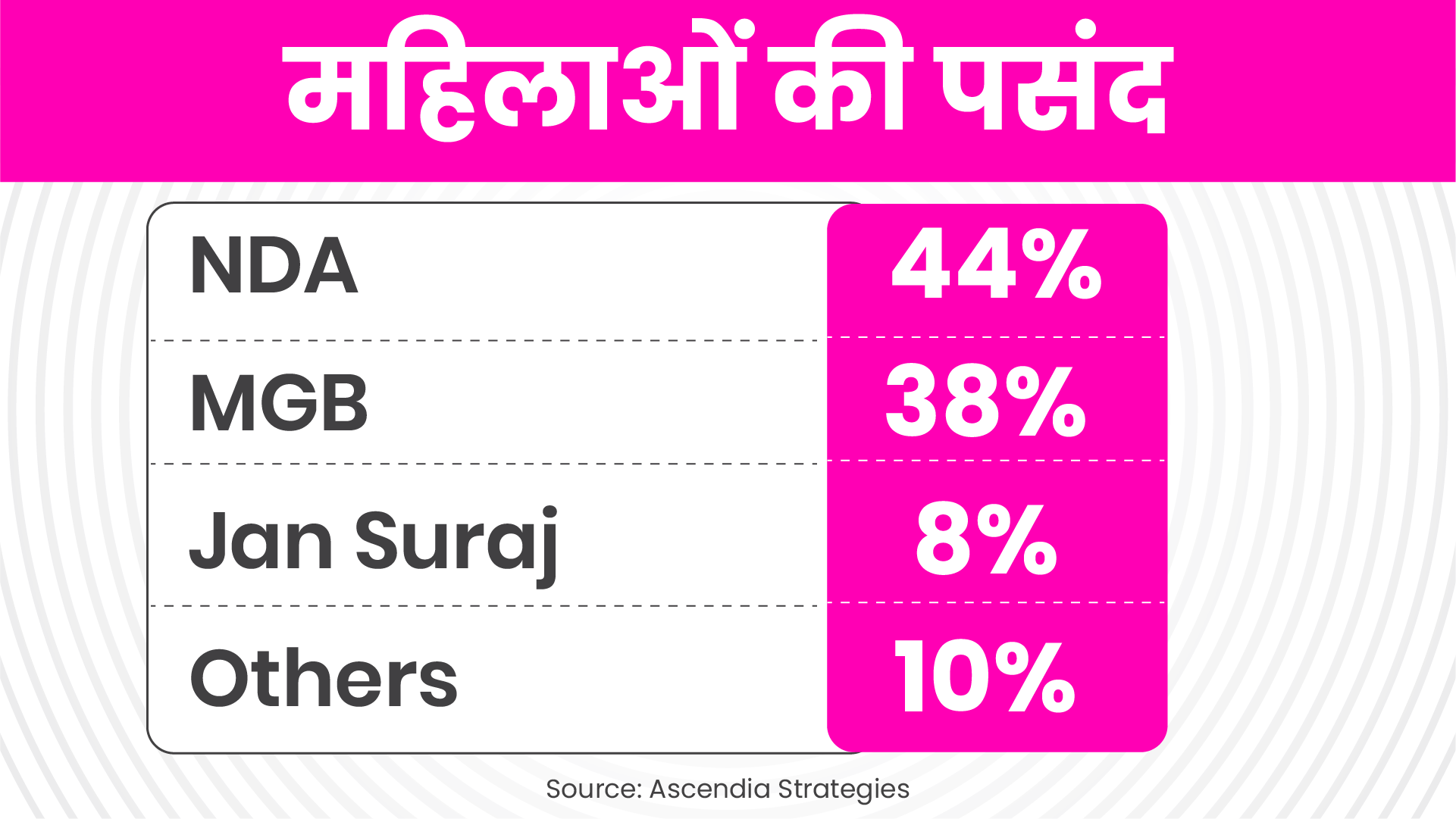 Ascendia के इस सर्वे में महिलाओं की पसंद जानने की कोशिश की गई है. इस सर्वे के मुताबिक सबसे ज्यादा 44 प्रतिशत महिलाएं NDA को वोट देने की बात कह रही है. यानी की एनडीए का कोर वोटर बेस जिसमें महिलाएं भी शामिल है, उन्होंने अभी भी इस सरकार पर अपना भरोसा बनाए रखा है.