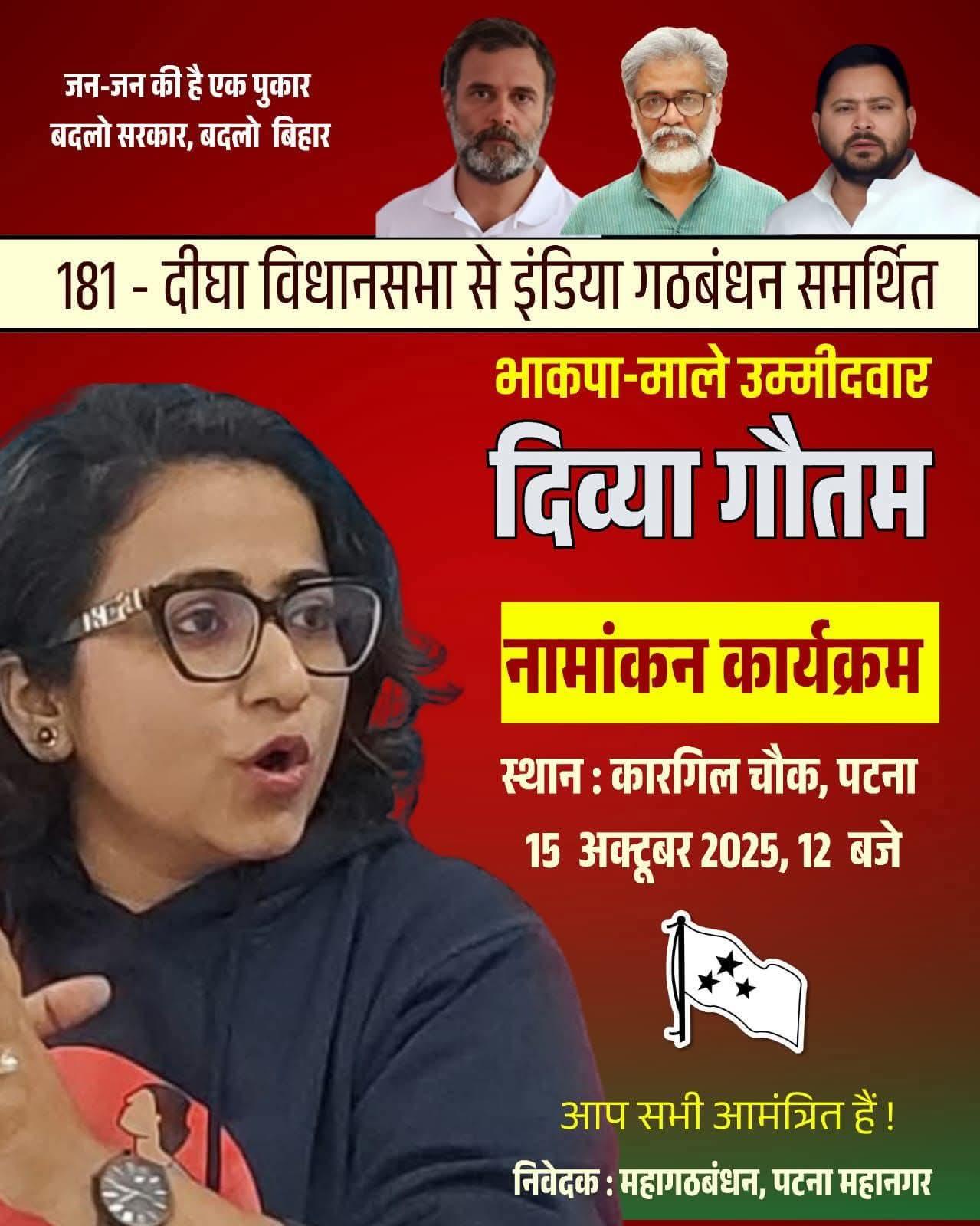 "181- दीघा विधानसभा से इंडिया गठबंधन समर्थित भाकपा-माले उम्मीदवार 'दिव्या गौतम' के नामांकन कार्यक्रम में आप सभी आमंत्रित है."