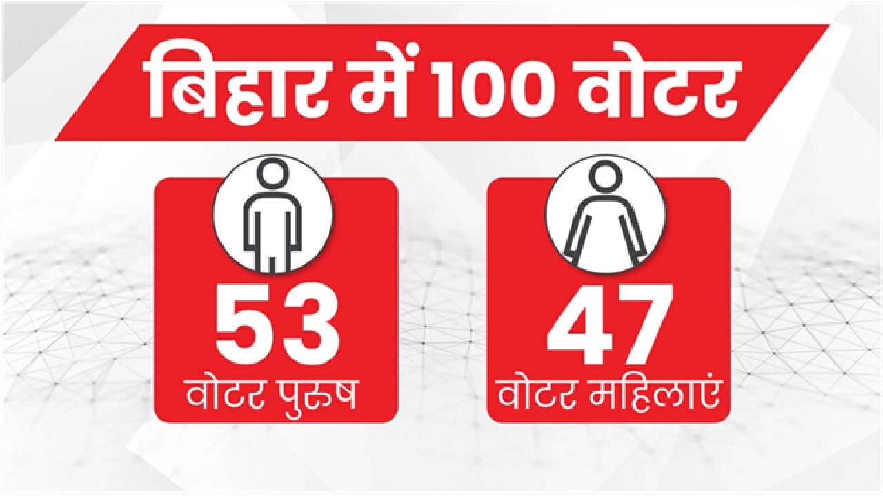 बिहार में 100 में से 53 वोटर पुरुष हैं जबकि 47 महिलाएं. संख्या में महिलाएं कम होने के बावजूद उनकी वोटिंग ज़्यादा होती है. पलायन के कारण पुरुषों का वोट कम पड़ता है. जब कुल मतदान होता है तो महिला और पुरुष का वोट लगभग बराबर हो जाता है. महिलाओं में लीड NDA को चुनाव जीता देती है.