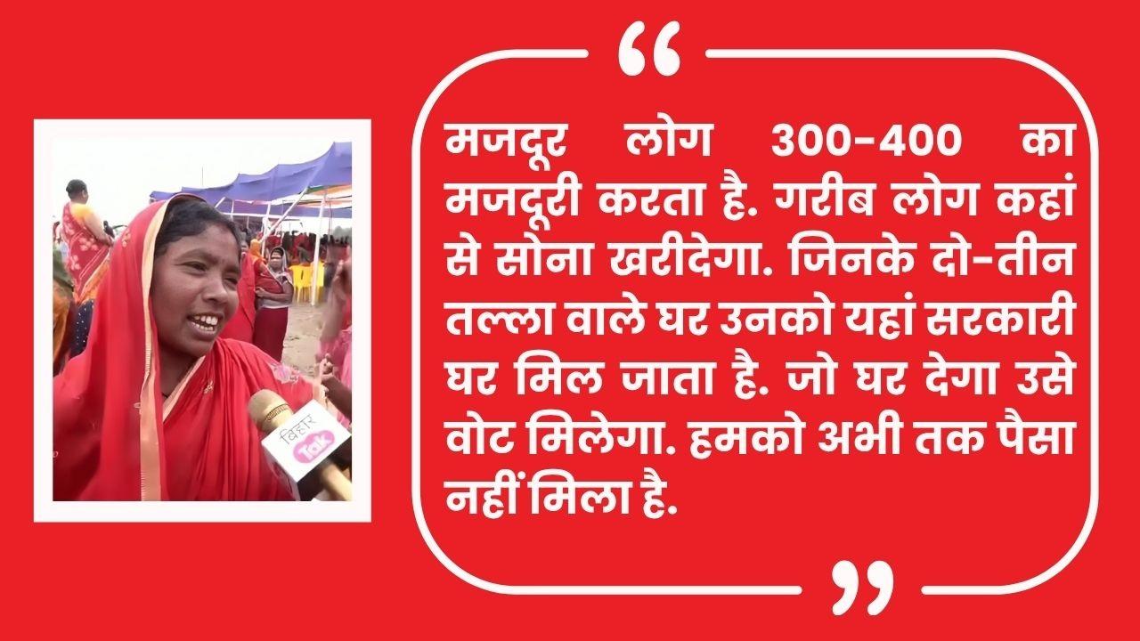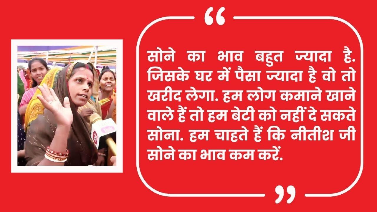 सभा में आईं महिलाओं की शिकायतें भी थीं, जैसे महंगाई. सिर्फ़ खाने पीने की चीज़ों की महंगाई नहीं, महंगा सोना भी मुद्दा है. उन्होंने कहा कि हम अपनी बेटी की शादी के लिए सोना ख़रीदने का सोच भी नहीं सकते. एक लाख तीस हज़ार रुपये दाम हो गया है. फिर भी ज़्यादातर महिलाओं का कहना था कि वोट नीतीश कुमार को जाएगा.