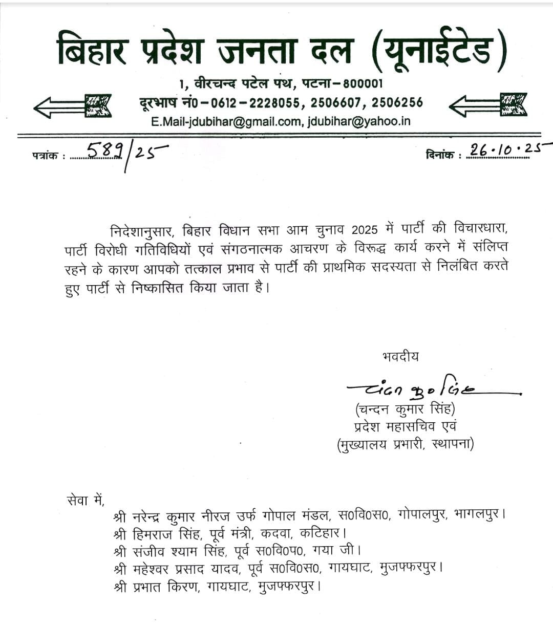 JDU के प्रदेश महासचिव और मुख्यालय प्रभारी चन्दन कुमार सिंह के नाम से जारी इस लेटर में कहा गया है कि बिहार विधान सभा आम चुनाव 2025 में पार्टी की विचारधारा, पार्टी विरोधी गतिविधियों और संगठनात्मक आचरण के विरूद्ध काम करने में शामिल रहने के कारण इन 5 नेताओं को तत्काल प्रभाव से पार्टी की प्राथमिक सदस्यता से निलंबित करते हुए पार्टी से निष्कासित किया जाता है. इसके बाद लेकट में पांच नेताओं के नाम बताए गए हैं.
