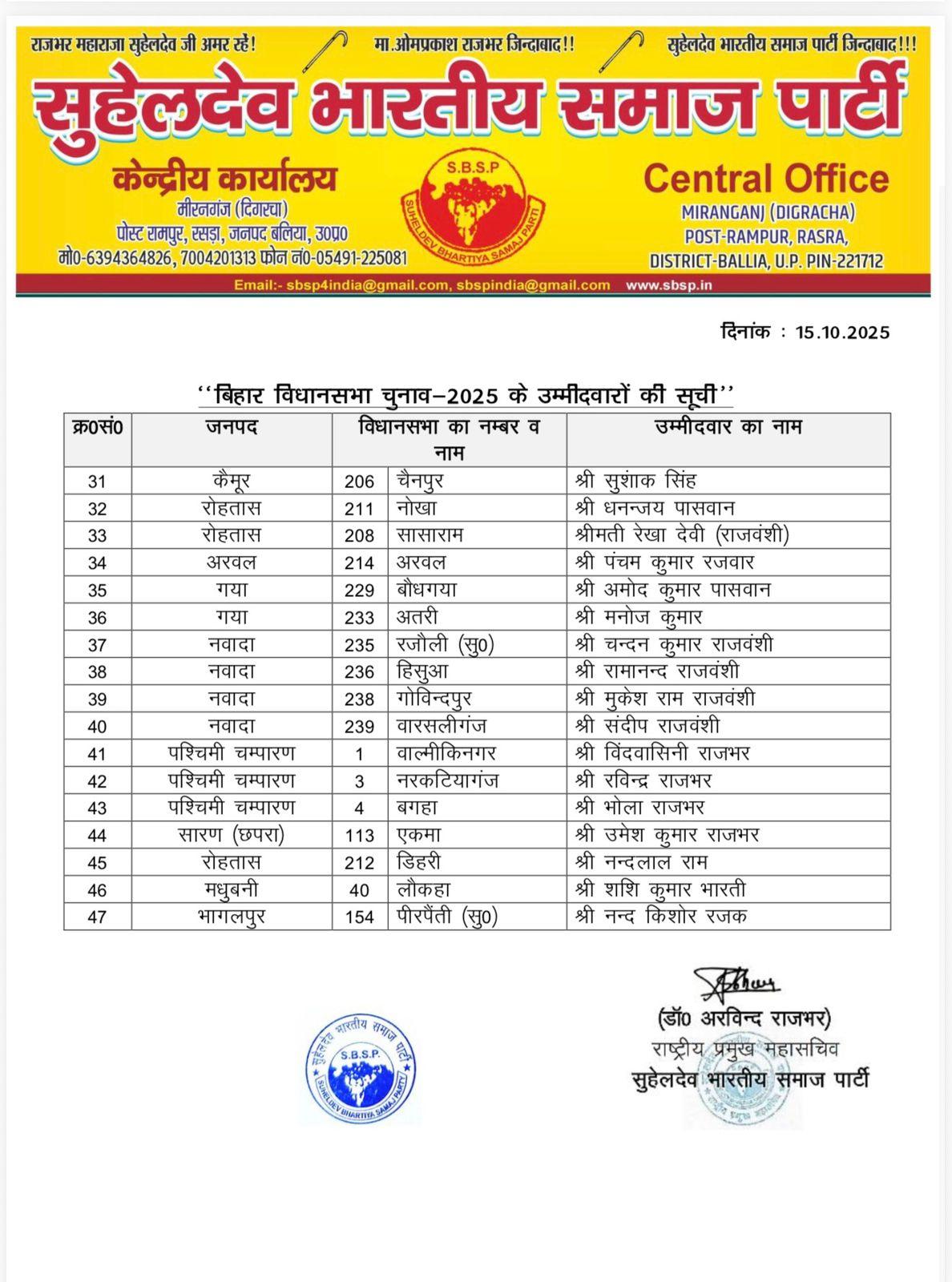 ओम प्रकाश राजभर की पार्टी ने बिहार चुनाव के लिए जारी की पहली लिस्ट, इन 47 सीटों पर उतारे उम्मीदवार