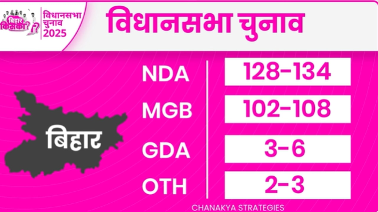 Bihar Election 2025 Survey: बिहार चुनाव से पहले CS (चाणक्य स्ट्रेटजी) का ताजा सर्वे सामने आया है, जिसने सियासी हलचल तेज कर दी है. सर्वे के मुताबिक, एनडीए (NDA) को इस बार भी बहुमत मिलने की संभावना है और 128 से 134 सीटें मिल सकती हैं. वहीं महागठबंधन को 102 से 108 सीटों के बीच सीमित बताया गया है.