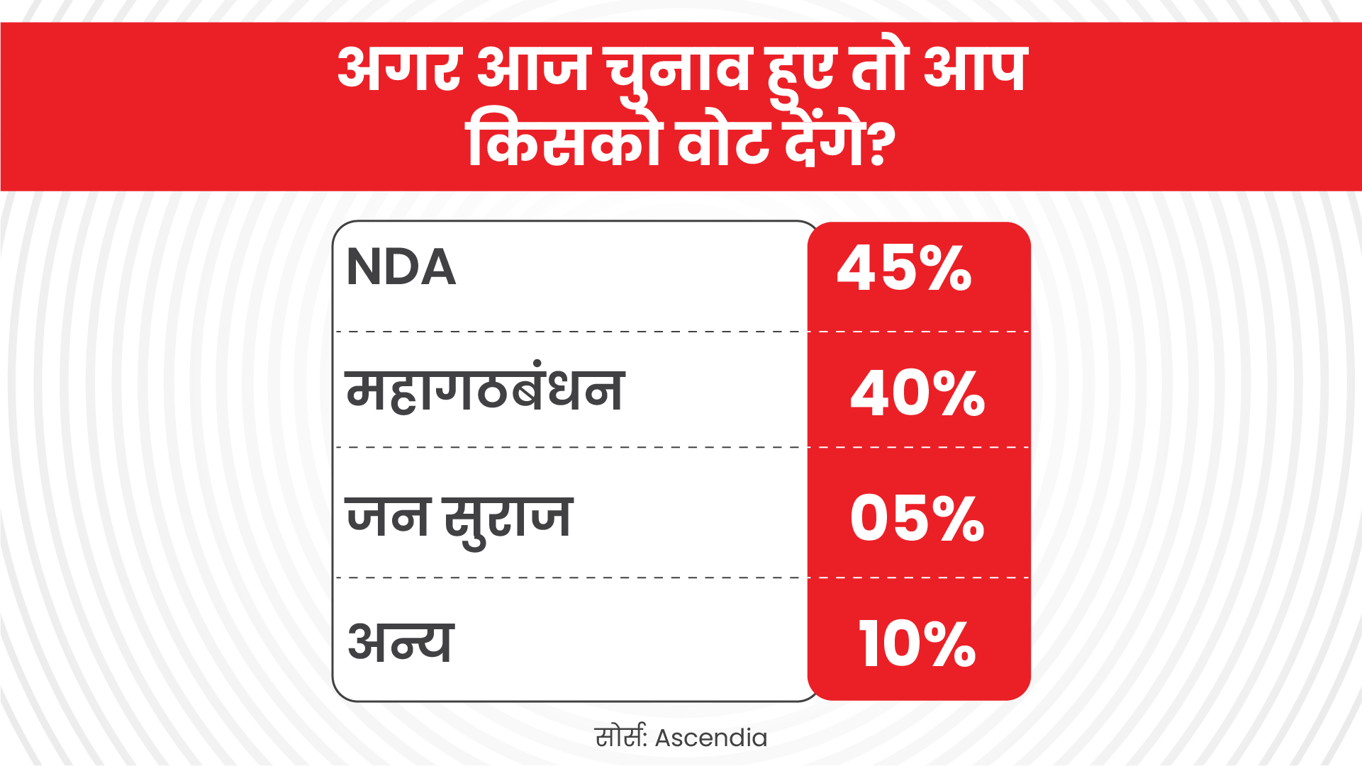 Ascendia ने इस सर्वे को 15 से 22 अक्टूबर के बीच किया जिसमें की कई वर्ग की महिलाएं शामिल थी. इस सर्वे में जब महिलाओं से सवाल किया गया कि, अगर आज चुनाव हुए तो आप किसको वोट देंगे? इसका जवाब बेहद ही चौंकाने वाला था. 45 प्रतिशत(45 %) महिलाओं का कहना है कि वे इस बार एनडीए यानी मौजूदा सरकार को ही वोट देगी.