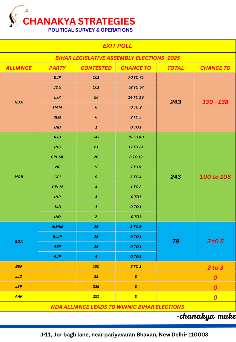 CHANAKYA STRATEGIES के एग्जिट पोल के मुताबिक में बिहार विधानसभा चुनाव में NDA को 243 में से 130 से लेकर 138 सीटें मिल सकती है. इसमें बीजेपी को 101 सीटों में 70 से 75 सीटें JDU को 101 में 52 से 57, LJP को 28 में 14 से 19, हम को 6 में से 0 से 2 के बीच RLM को 6 में 2 से 3 और IND को 0 से 1 के बीच सीटें मिलने का अनुमान जताया है.