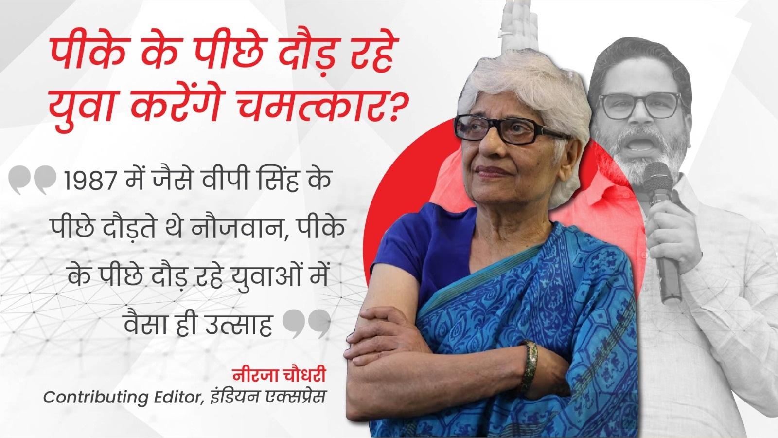 बिहार में इस बार करीब हर चौथा वोटर युवा (18 से 29 वर्ष) है. प्रशांत किशोर को इस वोटर ग्रुप से बहुत आस है. इंडियन एक्सप्रेस की Contributing Editor नीरजा चौधरी ने न्यूज Tak पर हमारे वीकली शो 'साप्ताहिक सभा' में बातचीत के दौरान कहा है कि प्रशांत किशोर बिहार में सभी जातियों के बीच चर्चा का विषय हैं. 1987 में जब विश्वनाथ प्रताप सिंह कांग्रेस से निकले थे तो उन्होंने जनमोर्चा शुरू किया था. वीपी सिंह जब यूपी में निकलते थे तो नौजवान तबका उनके पीछे दौड़ना शुरू कर देता था. वैसा ही कुछ प्रशांत किशोर के साथ और उनकी बातों में दिख रहा है. नीरजा चौधरी कहती हैं कि पीके के पीछे दौड़ रही भीड़ में भी उन्हें वैसा ही उत्साह दिखा है.