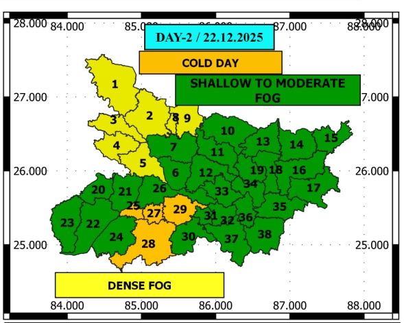 वही, अगर कल की बात करे तो 23 दिसंबर मंगलवार को उत्तर और दक्षिण-पश्चिम बिहार के कुछ जिलों में एक-दो स्थानों पर घना कोहरा छाने की संभावना है. इसमें पश्चिम चंपारण, पूर्वी चंपारण, बक्सर, भोजपुर, रोहतास और औरंगाबाद शामिल हैं. हालांकि 24 से 27 दिसंबर के बीच राज्य के किसी भी जिले में मौसम को लेकर कोई अलर्ट जारी नहीं किया गया है. इस दौरान पटना, गया, भागलपुर, मुंगेर, सुपौल, मधुबनी और सहरसा समेत पूरे बिहार में मौसम शुष्क बना रहेगा. वहीं, दिन के तापमान में धीरे-धीरे हल्की बढ़ोतरी देखने को मिल सकती है.