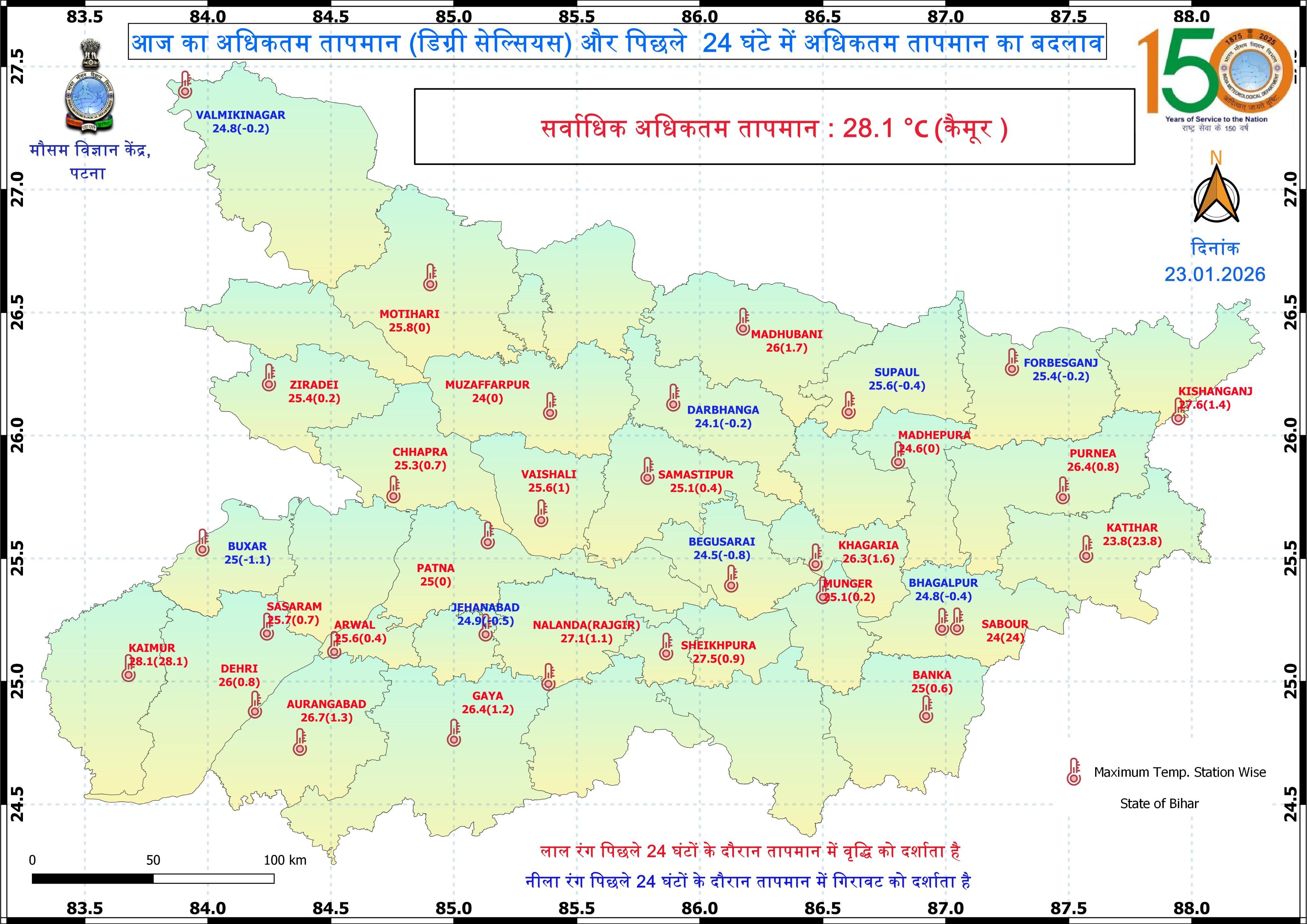 मौसम विभाग के अनुसार 24 जनवरी को भी बिहार में ठंड का दौर जारी रहेगा. सुबह के समय खासकर उत्तर और मध्य बिहार के जिलों में हल्का से मध्यम कोहरा छा सकता है, जबकि दिन में आसमान मुख्य रूप से साफ रहेगा. ठंडी उत्तर-पश्चिमी हवाओं के चलते रात और सुबह के समय कनकनी बनी रहेगी. अधिकतम तापमान में किसी बड़े बदलाव की संभावना नहीं है और यह सामान्य के आसपास ही रहेगा.