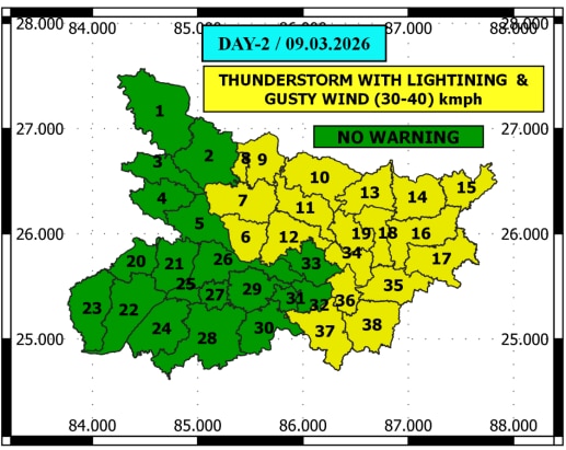 तापमान की बात करें तो अगले तीन दिनों के दौरान न्यूनतम तापमान में बढ़ोतरी होने की संभावना है. फिलहाल राज्य का न्यूनतम तापमान 17.5 डिग्री सेल्सियस से 23.4 डिग्री सेल्सियस के बीच बना हुआ है, जबकि अधिकतम तापमान 29.7 डिग्री सेल्सियस से 34.2 डिग्री सेल्सियस के करीब पहुंच रहा है. मौसम विभाग ने 9 मार्च के लिए विशेष रूप से 'येलो अलर्ट' जारी किया है, जिसके तहत उत्तर-मध्य और पूर्वी बिहार के जिलों में मेघगर्जन, वज्रपात (बिजली गिरना) और 30-40 किमी/घंटा की रफ्तार से तेज हवाएं चलने की चेतावनी दी गई है. लोगों को खराब मौसम के दौरान सुरक्षित स्थानों पर रहने की सलाह दी गई है.