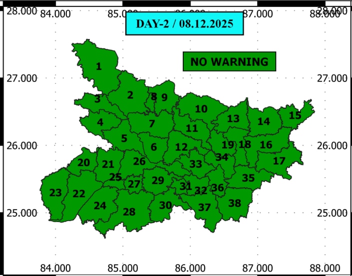 IMD के अनुसार आज यानी 8 दिसंबर को पूरे बिहार में किसी भी जिले में कोई मौसम अलर्ट नहीं है.