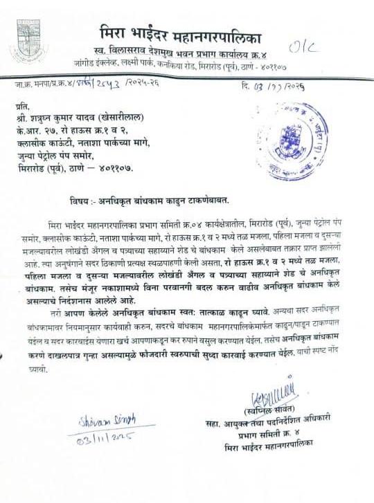 महानगरपालिका ने इस नोटिस को 3 नवंबर को जारी किया था. इसमें कहा गया है कि ठाणे में मीरा रोड पूर्व, वार्ड समिति क्रमांक 04 के हाउस नंबर 1 और 2 जो कि पुराने पेट्रोल पंप के सामने है, उसमें अवैध निर्माण की शिकायत मिली थी. इसमें इन रो हाउसेस में लोहे के एंगल और नींव की मदद से ग्राउंड फ्लोर, फस्ट फ्लोर और सेकंड फ्लोर पर शेड का निर्माण किया गया है. मौके पर निरीक्षण में सामने आया है कि रो हाउस 1 और 2 में पालिका से पास नक्शे को बदलकर एक्स्टा अवैध निर्माण किया गया है. जिसमें ग्राउंड फ्लोर के फर्श बिछाने के साथ-साथ पहले और दूसरे फ्लोर पर लोहे के एंगल और शीट की छत वाले शेड बनाए गए हैं. इसलिए, तुरंत इस अवैध निर्माण को हटा देना दें. अगर आप ऐसा नहीं करते हैं तो नियमानुसार इस निर्माण को ध्वस्त कर दिया जाएगा और तोड़ने की कार्रवाई का पूरा खर्च आपसे कर (टैक्स) के रूप में वसूला जाएगा.