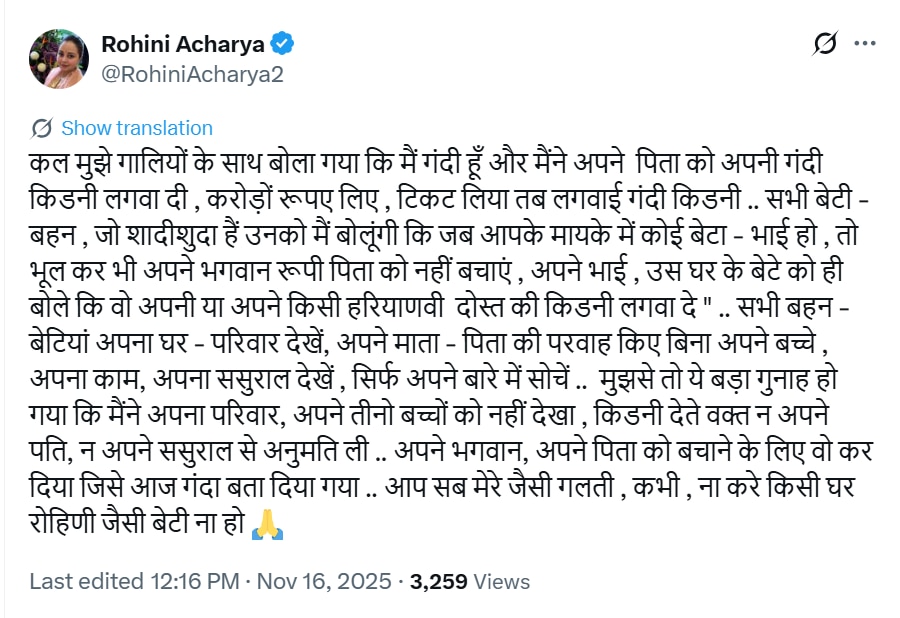 रोहिणी आचार्य ने अपने पोस्ट में लिया कि ''कल मुझे गालियों के साथ बोला गया कि मैं गंदी हूं और मैंने अपने पिता को अपनी गंदी किडनी लगवा दी, करोड़ों रूपए लिए, टिकट लिया तब लगवाई गंदी किडनी..सभी बेटी - बहन, जो शादीशुदा हैं उनको मैं बोलूंगी कि जब आपके मायके में कोई बेटा - भाई हो, तो भूल कर भी अपने भगवान रूपी पिता को नहीं बचाएं, अपने भाई , उस घर के बेटे को ही बोले कि वो अपनी या अपने किसी हरियाणवी दोस्त की किडनी लगवा दे."