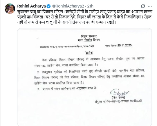 तेज प्रताप के पोस्ट के पोस्ट लालू प्रसाद यादव की सबसे चर्चित बेटी रोहिणी आचार्य ने भी सोशल मीडिया प्लेटफॉर्म X पर पोस्ट किया. हालांकि उन्होंने वहीं बातें लिखी जो तेज प्रताप ने अपने पोस्ट में लिखा है.