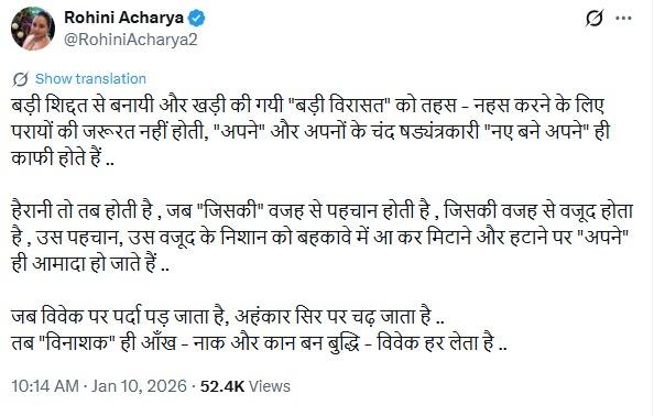 Rohini Acharya: बिहार विधानसभा चुनाव में RJD की करारी हार के बाद लालू प्रसाद यादव के परिवार में मचा घमासान थमने का नाम नहीं ले रहा है. लालू यादव की बेटी रोहिणी आचार्य ने एक बार फिर सोशल मीडिया पर अपनी भड़ास निकाली है. बिना किसी का नाम लिए उन्होंने अपने ही परिवार के सदस्यों पर 'विरासत' को नष्ट करने का गंभीर आरोप लगाया है. लेकिन उनके शब्दों का निशाना सीधे तौर पर उनके भाई और नेता प्रतिपक्ष तेजस्वी यादव की ओर माना जा रहा है.