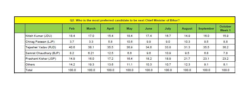 वहीं, मौजूदा मुख्यमंत्री नीतीश कुमार की लोकप्रियता में कमी देखी गई और केवल 15.9% लोगों ने उन्हें CM के रूप में चुना. जन स्वराज के संस्थापक प्रशांत किशोर 23.2% वोटों के साथ दूसरे स्थान पर रहे. इसके अलावा, चिराग पासवान को 8.8% और सम्राट चौधरी को 7.8% लोगों ने पसंद किया.