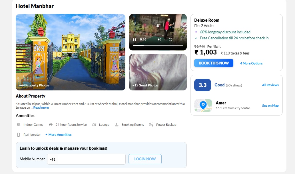 जयपुर में आमेर किला और शीश महल के पास मौजूद होटल मनभर एक किफायती विकल्प है. यहां ड्यूलैक्स रूम लॉन्ग स्टे डिस्काउंट के बाद बेहद किफायती रेट पर मिल जाता है. होटल में फ्री वाई-फाई, एसी, गार्डन, टेरेस, पार्किंग और 24 घंटे पहले तक फ्री कैंसिलेशन की सुविधा उपलब्ध है.