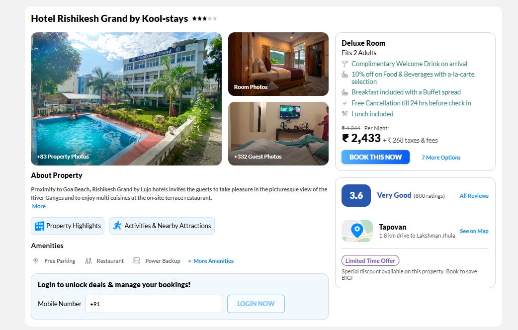 यह एक थ्री-स्टार होटल है, जहां ड्यूलैक्स रूम किफायती दाम में मिल जाता है. स्टे के साथ ब्रेकफास्ट, लंच, फ्री वाई-फाई, पिक-अप ड्रॉप और 24 घंटे सुरक्षा की सुविधा दी जाती है. फ्री कैंसिलेशन का ऑप्शन भी मौजूद है. कीमत 2,433 रुपए +जीएसटी यानी करीबन 2700 का होंगे. इसमें आपको ब्रेकफास्ट, लंच भी मिलेगा ये सभी फैसिलिटीज आपको इसमें मिल जाएगी.