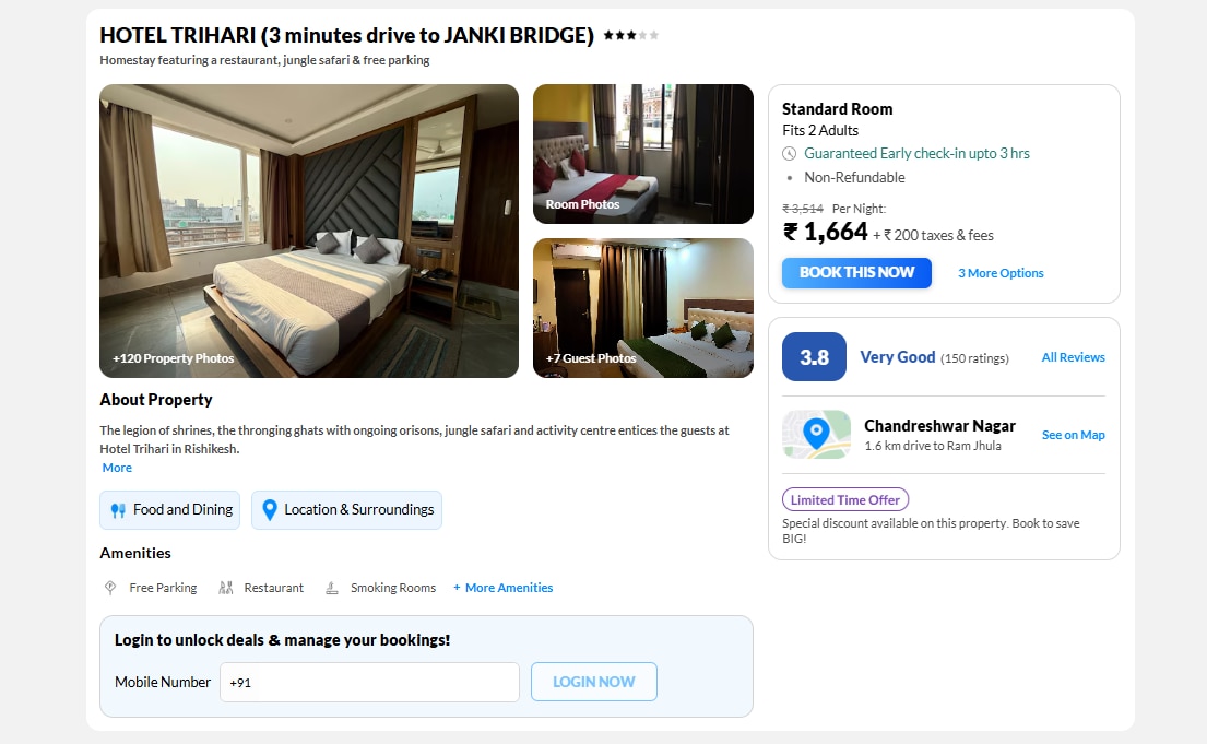 जानकी ब्रिज से कुछ ही मिनट की दूरी पर स्थित होटल त्रिहारी बजट ट्रैवलर्स के लिए अच्छा विकल्प है. यहां अर्ली चेक-इन की सुविधा है और आसपास कई कैफे और रेस्टोरेंट मौजूद हैं. स्टैंडर्ड रूम की कीमत की बात करें तो 1,660 रुपए के करीब +GST के साथ मिल सकता है.