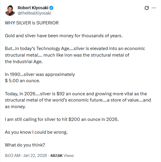 पिछले कुछ समय से कियोसाकी खासतौर पर चांदी पर जोर दे रहे हैं. वे इसे आम लोगों के लिए अमीर बनने का बड़ा अवसर बताते हैं. 22 जनवरी को एक्स पोस्ट में उन्होंने अंदाजा लगाया कि 2026 में चांदी की कीमत 200 डॉलर प्रति औंस (करीब ₹5.30 लाख से ₹5.40 लाख प्रति किलो) तक पहुंच सकती है.