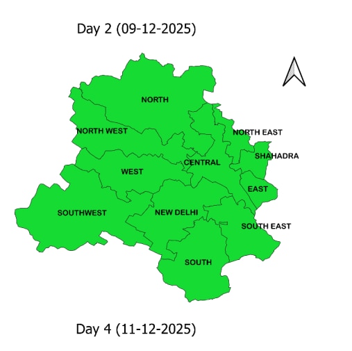 मौसम विभाग के अनुसार, 10 और 11 दिसंबर को दिल्ली में तापमान और नीचे जा सकता है. इस दौरान न्यूनतम तापमान 6 से 9°C तक गिरने की संभावना जताई गई है. वहीं सुबह के समय हल्का कोहरा छाने की संभावना है. वहीं, 13 दिसंबर के बाद यहां एक हल्का वेस्टर्न डिस्टर्बेंस असर डाल सकता है. IMD के अनुसार अगले 48 घंटों में ठंड बढ़ेगी और सुबह की धुंध और गहरी होगी. हालांकि, फिलहाल किसी भी जिले में कोल्ड वेव अलर्ट जारी नहीं किया गया है, लेकिन IMD ने कहा कि 10 दिसंबर के बाद कई जगह तापमान सामान्य से नीचे रह सकता है.