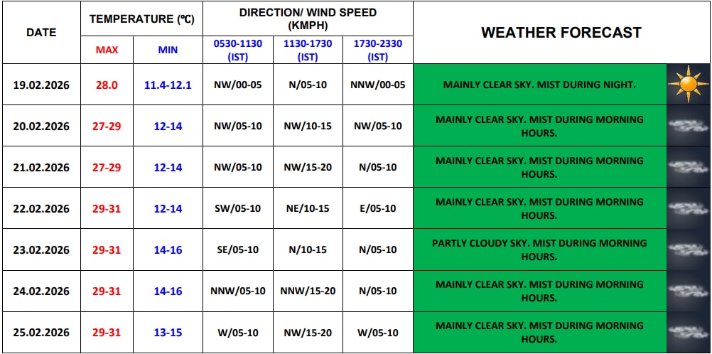 मौसम विभाग के अनुसार अगले 5 से 7 दिनों तक अधिकतम तापमान सामान्य से 3 से 5 डिग्री ऊपर रह सकता है. 22 फरवरी के बाद तापमान 29 से 31 डिग्री सेल्सियस तक पहुंच सकता है, जिससे दोपहर में हल्की गर्मी महसूस होने लगेगी. 23 फरवरी को आंशिक रूप से बादल छाने की संभावना है, लेकिन उससे पहले और बाद के दिनों में आसमान साफ रहने का अनुमान है. सुबह के समय हल्की धुंध की स्थिति बनी रह सकती है, हालांकि घना कोहरा बनने की संभावना नहीं जताई गई है.