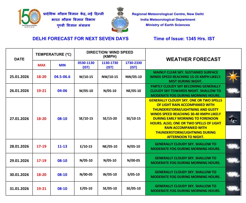 मौसम विभाग की चेतावनी के अनुसार, 26 जनवरी की रात से एक नया पश्चिमी विक्षोभ उत्तर-पश्चिम भारत को प्रभावित करना शुरू करेगा. इसके असर से दिल्ली में 27 और 28 जनवरी को बादल छाए रहेंगे और कुछ इलाकों में हल्की बूंदाबांदी या गरज के साथ छींटे पड़ सकते हैं. विभाग ने सलाह दी है कि 28 जनवरी के आसपास तेज हवाएं चलने और बादल छाने के कारण दिन के तापमान में थोड़ी गिरावट आ सकती है. इसके बाद 30 जनवरी की रात से एक और पश्चिमी विक्षोभ सक्रिय होने की संभावना है जो जनवरी के अंत तक मौसम को अस्थिर बनाए रखेगा.