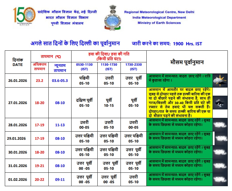 Delhi Weather Update: बारिश और तेज हवाओं से बदलेगा दिल्ली मौसम, IMD ने 27 जनवरी के लिए जारी की ये चेतावनी