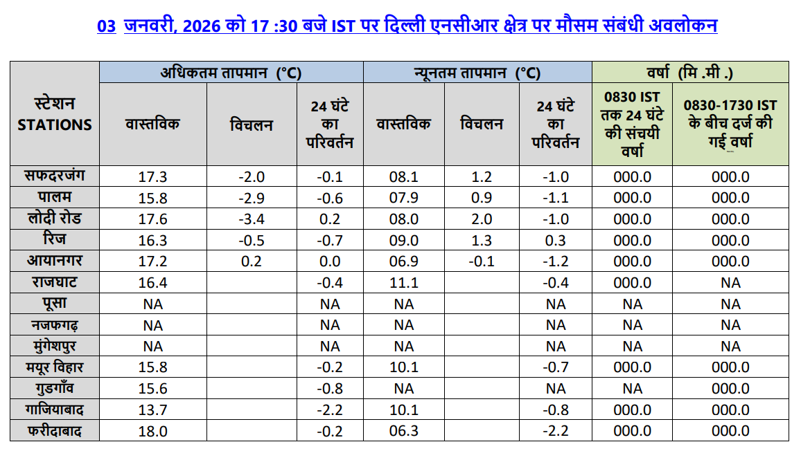 मौसम विभाग के अनुसार 4 जनवरी को दिल्ली के उत्तरी, उत्तर-पश्चिमी, उत्तर-पूर्वी, पश्चिमी, मध्य, पूर्वी, दक्षिणी और दक्षिण-पश्चिमी दिल्ली में सुबह के समय मध्यम से घना कोहरा छाने की संभावना है. दिन के वक्त आसमान साफ रहेगा. लेकिन सुबह के समय विजिबिलिटी कम हो सकती है. आनंद विहार, रोहिणी, मुंडका, जहांगीरपुरी, चांदनी चौक और वजीरपुर जैसे इलाकों में कोहरे का असर ज्यादा रह सकता है जिससे सड़क और रेल यातायात प्रभावित होने की आशंका है.