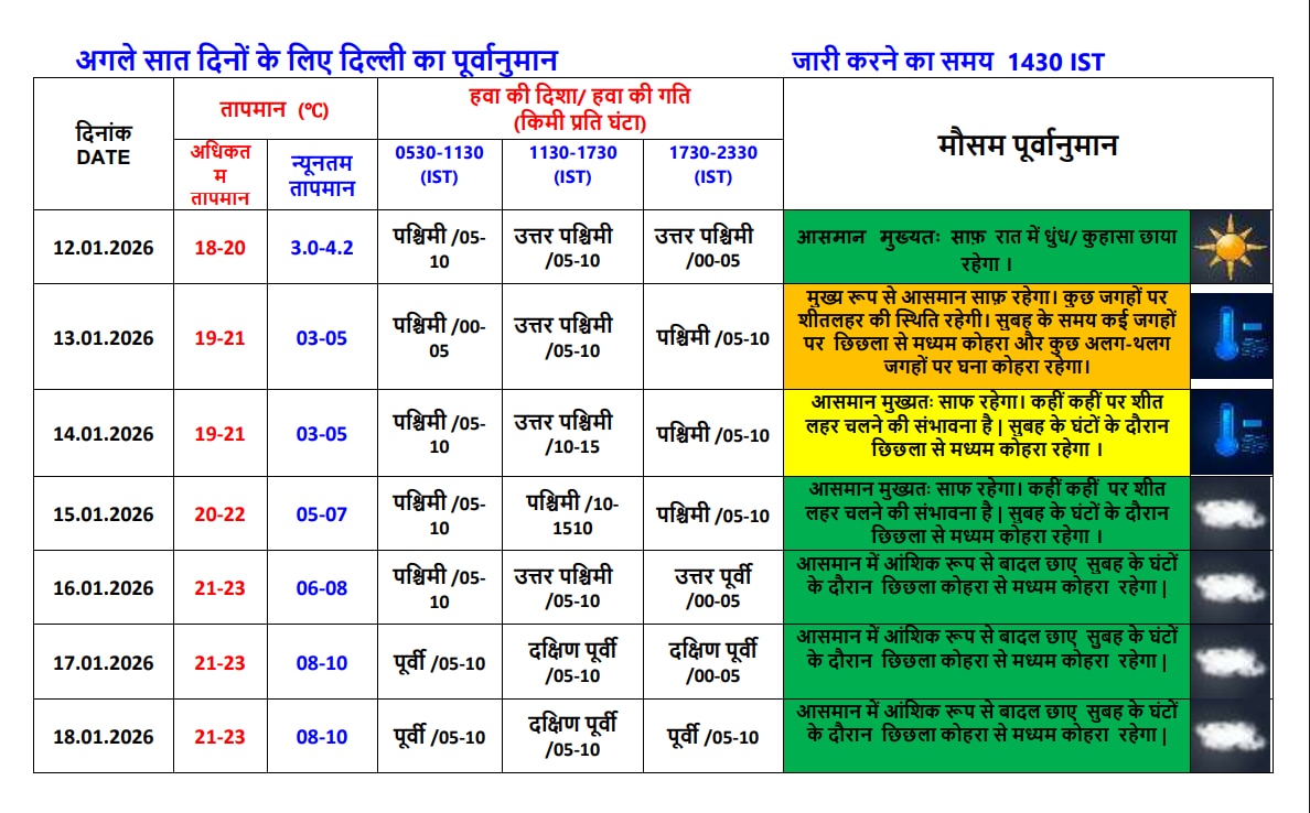 अगले 4 दिनों के दौरान दिल्ली का अधिकतम तापमान सामान्य से -1.5 डिग्री सेल्सियस से 1.5 डिग्री सेल्सियस रहने की संभावना है. इसके बाद सामान्य से ऊपर यानी 1.6 डिग्री सेल्सियस से 3.0 डिग्री सेल्सियस रहने का अनुमान है. वहीं, 14 जनवरी, 2026 को दिल्ली में अलग-अलग जगहों पर शीतलहर की स्थिति बन सकती है. हालांकि, अगले 3 दिनों के दौरान आसमान मुख्य रूप से साफ रहने की संभावना है. इसके बाद आंशिक रूप से बादल छाए रहेंगे.