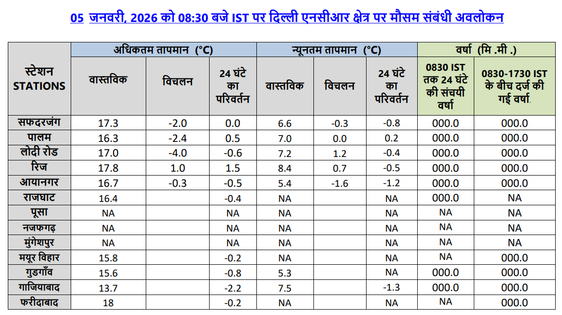 माैसम विभाग के अनुसार आज यानी 6 जनवरी 2026 को दिल्ली में सुबह के समय कुछ जगहों पर छिछला कोहरा और मध्यम कोहरा छाने की संभावना है. हालांकि, दोपहर के समय मौसम साफ रहेगा. IMD के मुताबिक दिल्ली में आज अधिकतम तापमान 18 से 20 डिग्री सेल्सियस और न्यूनतम तापमान 6 से 8 डिग्री सेल्सियस के बीच रहने का अनुमान है. मौसम विभाग के अनुसार, आज सुबह उत्तरी दिल्ली, उत्तर पूर्व दिल्ली, उत्तर-पश्चिम दिल्ली, पश्चिमी दिल्ली, दक्षिण दिल्ली, दक्षिण-पश्चिम दिल्ली, दक्षिण-पूर्वी दिल्ली, नई दिल्ली, मध्य दिल्ली, पूर्वी दिल्ली, शाहदरा, फरीदाबाद, गुडगांव, नोएडा और गाजियाबाद में कुछ जगहों पर कोहरा छाया रहेगा. मौसम विभाग का ऑफिशियल पीडीएफ देखने के लिए यहां क्लिक करें