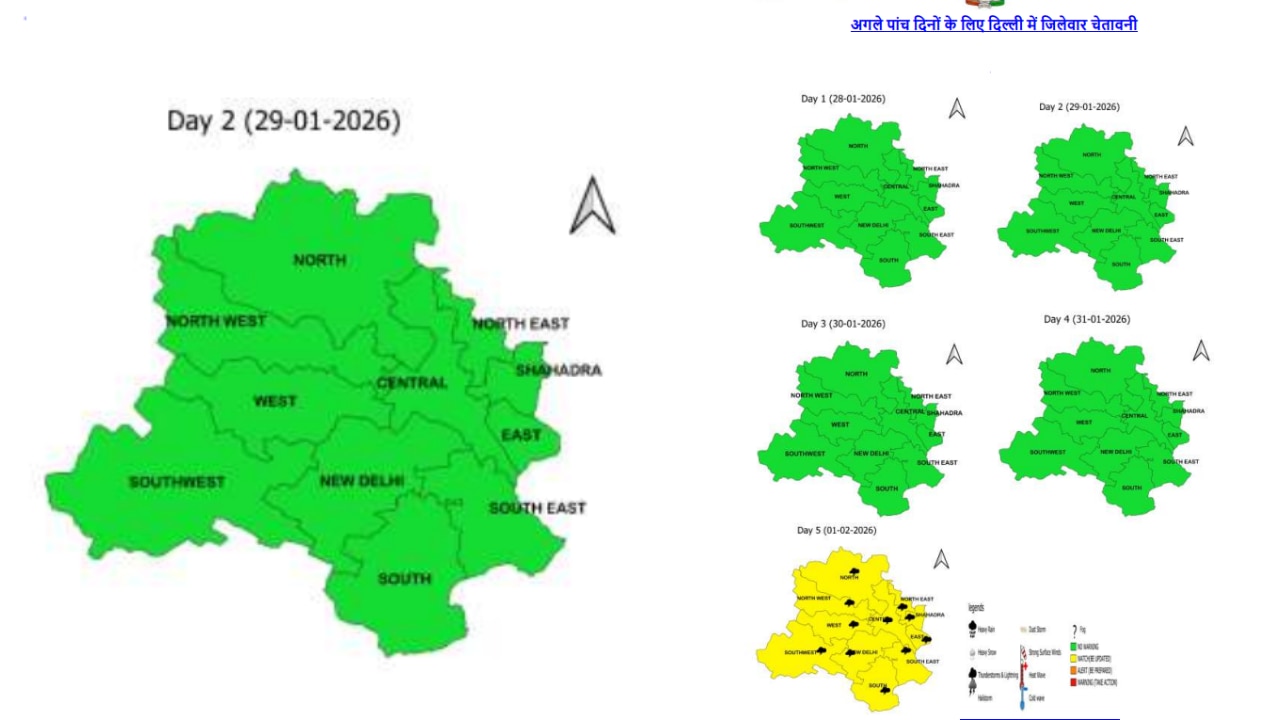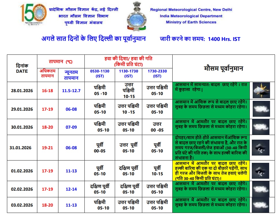 अगले सात दिनों तक दिल्ली में बादलों की आवाजाही जारी रहेगी. 30 जनवरी को भी सुबह मध्यम कोहरा रहने की संभावना है. 1 फरवरी 2026 को लेकर विभाग ने येलो अलर्ट जारी किया है. इस दिन नई दिल्ली, शाहदरा, मध्य दिल्ली और दक्षिण पूर्वी दिल्ली सहित पूरी राजधानी में हल्की बारिश की बौछारें पड़ने की संभावना है. ऐसे में बारिश के बाद तापमान के एक बार फिर से बढ़ोतरी का अनुमान है.