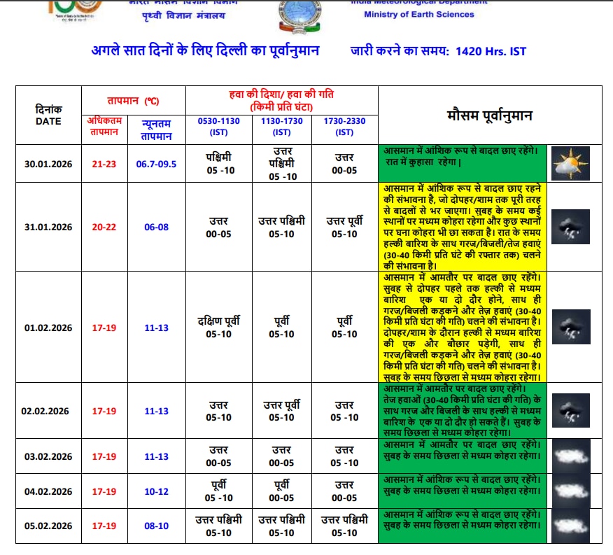 आज यानी 31 जनवरी को दिल्ली के मौसम में काफी उतार चढ़ाव देखने को मिलेगा. मौसम विभाग के अनुसार सुबह के समय दिल्ली के कई स्थानों पर मध्यम कोहरा रहेगा. वहीं कुछ इलाकों में घना कोहरा छाने की भी संभावना है. दिन चढ़ने के साथ ही आसमान में आंशिक रूप से बादल छाए रहेंगे जो दोपहर या शाम तक पूरी तरह से घने हो जाएंगे. सबसे महत्वपूर्ण बदलाव रात के समय देखने को मिलेगा जब दिल्ली के विभिन्न हिस्सों में हल्की बारिश के साथ गरज-चमक और 30-40 किमी प्रति घंटे की रफ्तार से तेज हवाएं चलने की संभावना है.