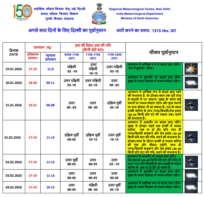 आने वाले दिन दिल्ली एनसीआर के लिए काफी चुनौतीपूर्ण हो सकते हैं. 31 जनवरी की सुबह दिल्ली के कुछ स्थानों पर घना कोहरा छाने की प्रबल संभावना है. इसके बाद 31 जनवरी की रात से लेकर 2 फरवरी तक नई दिल्ली, गुरुग्राम, नोएडा, और गाजियाबाद सहित पूरे एनसीआर में हल्की से मध्यम बारिश गरज चमक और 30 से 40 किमी प्रति घंटे की रफ्तार से तेज हवाएं चलने का येलो अलर्ट जारी किया गया है. 2 फरवरी को एक और नए पश्चिमी विक्षोभ के सक्रिय होने से बारिश का यह दौर जारी रह सकता है. इससे अधिकतम तापमान में और गिरावट आने की उम्मीद है.
