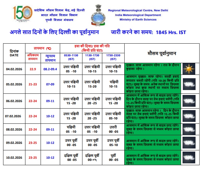 मौसम विभाग के अनुसार 5 फरवरी को दिल्ली में आसमान में आंशिक रूप से बादल छाए रहने की संभावना है. सुबह के समय मध्यम कोहरा छाया रहेगा. दिन के समय ठंडी हवाएं चलने का अनुमान है जिनकी स्पीड 15 से 20 किलोमीटर प्रति घंटा तक हो सकती है. कोहरे और धुंध के कारण पालम और सफदरजंग जैसे इलाकों में विजिबिलिटी कम रहने की आशंका है जिससे यातायात और उड़ानों पर असर पड़ सकता है.