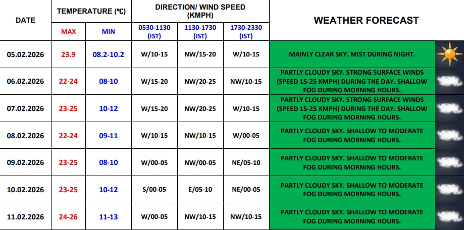 मौसम विभाग के अनुसार 6 फरवरी को दिल्ली-NCR में आंशिक रूप से बादल छाए रहेंगे. इसके अलावा दिन के समय 15-25 किमी प्रति घंटे की रफ्तार से तेज सतही हवाएं चलने की संभावना है.सुबह के समय हल्का कोहरा रह सकता है, जबकि अधिकतम तापमान 22-24 डिग्री सेल्सियस और न्यूनतम तापमान 8-10 डिग्री सेल्सियस के आसपास रहने का अनुमान है.