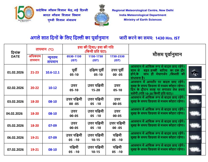 वहीं आज के मौसम की बात करें तो आज 2 फरवरी को दिल्ली में आसमान में बादल छाए रहेंगे. यहां सुबह के समय हल्के से मध्यम कोहरे देखने को मिल सकता है. मौसम विभाग के अनुसार आज दिल्ली के सफदरजंग, पालम और लोधी रोड जैसे इलाकों में अधिकतम तापमान 20 से 22 डिग्री सेल्सियस और न्यूनतम तापमान 10 से 12 डिग्री सेल्सियस के बीच रहने का अनुमान है. वहीं दोपहर के समय 15 से 20 किलोमीटर प्रति घंटे की रफ्तार से चलने वाली उत्तर पश्चिमी हवाएं ठंड में इजाफ करेंगी.