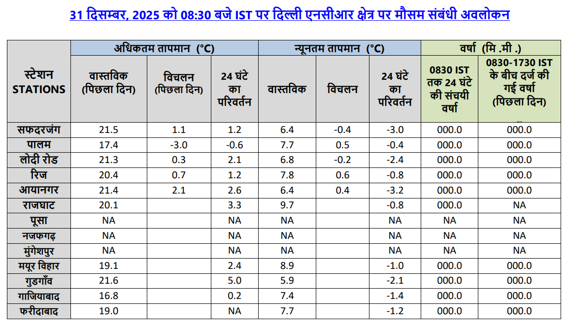 माैसम विभाग के मुताबिक आज यानी 1 जनवरी 2026 को आसमान में आंशिक रूप से बादल छाने का अनुमान है. हालांकि, इसके बाद मुख्य रूप से आसमान साफ रहेगा. IMD के मुताबिक आज दिल्ली का अधिकतम तापमान सामान्य से कम यानी 14 से 16 डिग्री सेल्सियस के बीच रहने का अनुमान है. न्यूनतम तापमान सामान्य से अधिक रहने की यानी 9 से 11 डिग्री सेल्सियस के बीच रहने की संभावना है.
