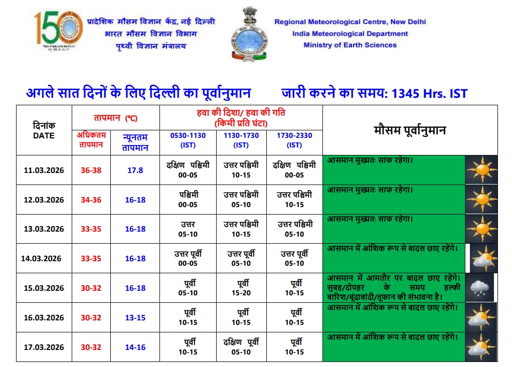 मौसम विभाग ने अनुसार आज यानी 12 मार्च को दिल्ली के आसमान में साफ रहेगा. नई दिल्ली, उत्तर-पूर्वी दिल्ली, दक्षिण-पश्चिमी दिल्ली और शाहदरा समेत लगभग सभी जिलों में आसमान में धूप देखने को मिलेगी. IMD के मुताबिक, आज अधिकतम तापमान 36 डिग्री सेल्सियस के आसपास रहने की उम्मीद है, जो सामान्य से काफी ऊपर है. लोदी रोड, रिज और सफदरजंग जैसे इलाकों में दोपहर के समय तेज धूप का असर रहेगा.