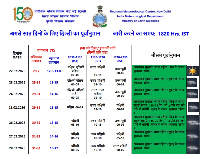 आने वाले एक हफ्ते तक दिल्ली में आसमान मुख्य रूप से साफ बना रहेगा. IMD के अनुसार फिलहाल दिल्ली में बारिश की कोई संभावना नहीं है. हालांकि इस बीच 25 और 26 फरवरी को नोएडा, गुरुग्राम, फरीदाबाद और गाजियाबाद समेत पूरी दिल्ली में 15 से 25 किमी प्रति घंटे की रफ्तार से तेज सतही हवाएं चलने का अनुमान जताया गया है. वही फरवरी के अंत तक यानी 27 और 28 फरवरी को गर्मी का प्रभाव और बढ़ेगा. मौसम विभाग ने फिलहाल कोई भी चेतावनी जारी नहीं की है.