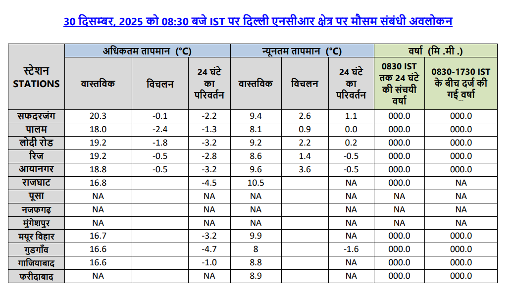 माैसम विभाग के मुताबिक आज यानी 31 दिसंबर 2025 को आसमान में आंशिक रूप से बादल छाने की संभावना है. वहीं, सुबह के समय अनेक स्थानों पर मध्यम कोहरा कुछ स्थानों पर घना कोहरा रहेगा. IMD के मुताबिक आज दिल्ली का अधिकतम तापमान सामान्य से कम यानी 21 से 23 डिग्री सेल्सियस के बीच रहने का अनुमान है. न्यूनतम तापमान सामान्य से अधिक रहने की यानी 7 से 9 डिग्री सेल्सियस के बीच रहने की संभावना है. मौसम विभाग के मुताबिक आज सुबह उत्तर पूर्वी दिल्ली, दक्षिण दिल्ली,दक्षिण-पश्चिम दिल्ली, दक्षिण पूर्वी दिल्ली, नई दिल्ली, पूर्वी दिल्ली, गुरुग्राम, नोएडा, गाजियाबाद उत्तरी, उत्तर-पश्चिम दिल्ली,पश्चिम दिल्ली, मध्य दिल्ली, शाहदरा और फरीदाबाद में मध्यम से घना कोहरा का येलो अलर्ट जारी किया है. वही दिन में आंशिक रूप से बादल छाए रहेंगे. मौसम विभाग का ऑफिशियल पीडीएफ देखने के लिए यहां क्लिक करें.