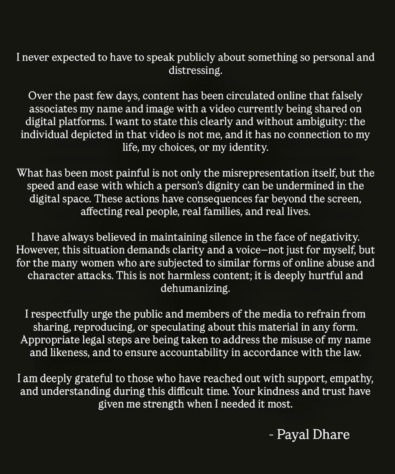 पायल ने स्टेटमेंट में लिखा- 'मुझे कभी उम्मीद नहीं थी कि मुझे इतनी निजी और दुखदायी बात पर पब्लिकली बोलना पड़ेगा. पिछले कुछ दिनों में ऑनलाइन ऐसा कंटेंट वायरल किया गया है, जिसमें डिजिटल प्लेटफॉर्म पर शेयर हो रहे एक वीडियो के साथ मेरा नाम और मेरी तस्वीर जोड़ी जा रही है. मैं यह बात बिल्कुल साफ और बिना किसी भ्रम के कहना चाहती हूं कि उस वीडियो में दिख रही लड़की मैं नही हूं और उसका मेरी जिंदगी, मेरे फैसलों या मेरी पहचान से कोई लेना-देना नहीं है. मैं हमेशा निगेटिविटी के सामने चुप्पी बनाए रखने में विश्वास हूं, लेकिन यह सच बताने की मांग करती है- सिर्फ मेरे लिए नहीं, बल्कि उन तमाम महिलाओं के लिए भी जो इसी तरह के ऑनलाइन उत्पीड़न और चरित्र हनन का शिकार होती हैं. यह बेहद आहत करने वाला और अमानवीय है.'