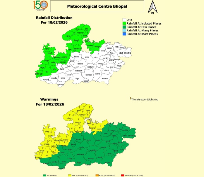 मौसम विभाग ने आज यानी 18 फरवरी को मध्य प्रदेश के कई जिलों में येलो अलर्ट जारी किया है. विभाग के अनुसार आज ग्वालियर, दतिया, भिंड, मुरैना, श्योपुर कलां, राजगढ़, नीमच और मंदसौर में गरज चमक के साथ हल्की से मध्यम बारिश हो सकती है. इसके अलावा अनूपपुर, शहडोल, उमरिया, डिंडोरी और जबलपुर सहित पूर्वी मध्य प्रदेश के कई हिस्सों में ओलावृष्टि होने का भी अनुमान है.