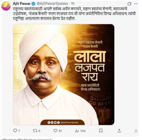 अजित पवार ने बुधवार सुबह 8 बजकर 57 मिनट पर सोशल मीडिया प्लेटफॉर्म 'एक्स' (ट्विटर) पर अपना आखिरी पोस्ट साझा किया था. यह पोस्ट महान स्वतंत्रता सेनानी लाला लाजपत राय की जयंती पर उन्हें समर्पित था. अपनी पोस्ट में उन्होंने लिखा, ''महान स्वतंत्रता सेनानी, स्वराज्य के प्रचारक, 'पंजाब केसरी' लाला लाजपत राय जी को उनकी जयंती पर विनम्र श्रद्धांजलि, जिन्होंने देश की आजादी के लिए अपना सब कुछ कुर्बान कर दिया! उनकी देशभक्ति हमें हमेशा प्रेरित करती रहेगी."