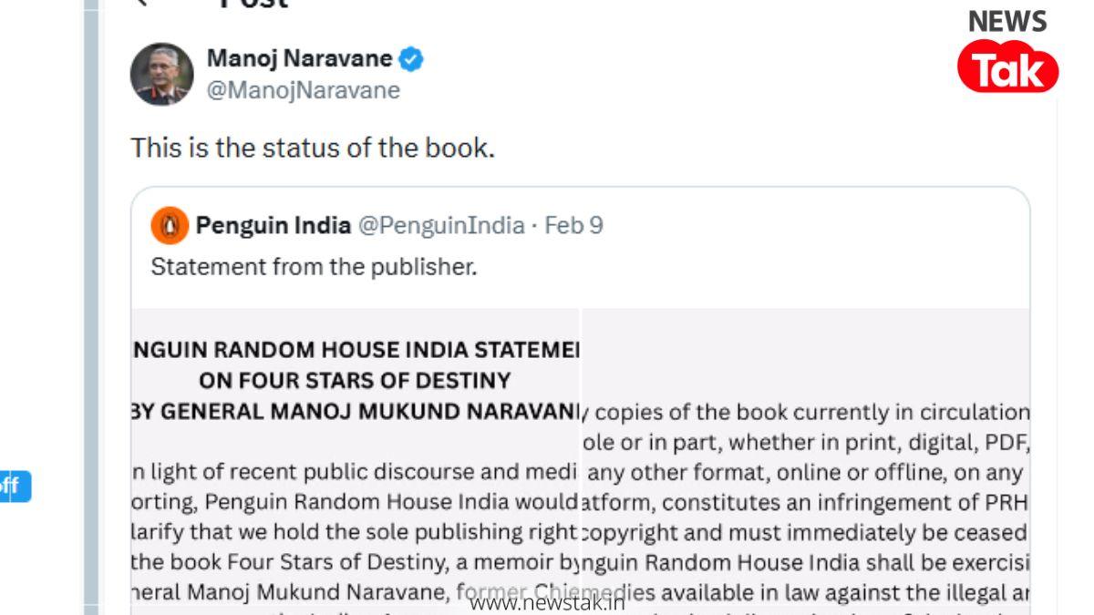 पूर्व आर्मी चीफ मनोज मुकुंद नरवणे ने पेंगुइन का एक पोस्ट साझा लिखा- 'यह किताब का स्टेटस है.'