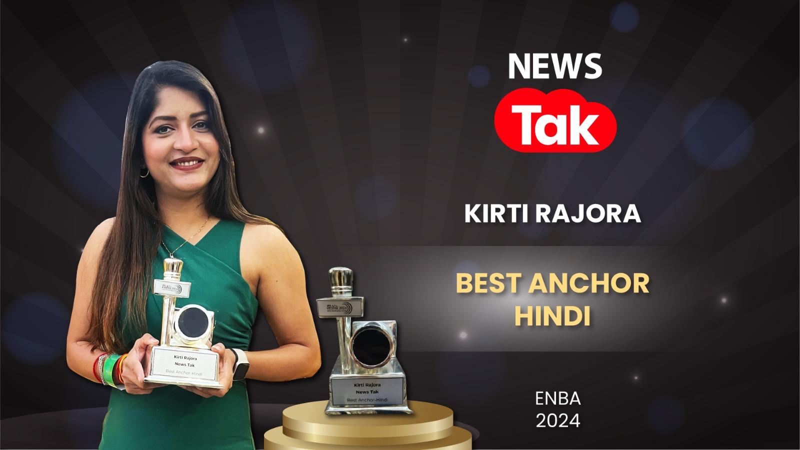 इसी के साथ News Tak की एंकर कीर्ति रजोरा को बेस्ट एंकर हिंदी कैटिगरी में सिल्वर अवॉर्ड से सम्मानित किया गया. उनकी बेहतरीन एंकरिंग, ग्राउंड से जुडा सवाल पूछने का अंदाज और भरोसेमंद प्रेजेन्टेशन को खास तौर पर पसंद किया जा रहा है आई.